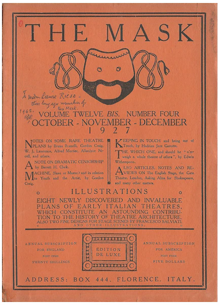 This was a theatrical magazine published in Florence by Edward Gordon Craig, illegitimate son of Dame Ellen Terry. Topics in this quarterly edition: Notes on some Rare Theatre Plans; A Note on Dramatic Censorship; Machine - Slave or Master?; Keeping in Touch; The Which One; Articles, Notes and Reviews.